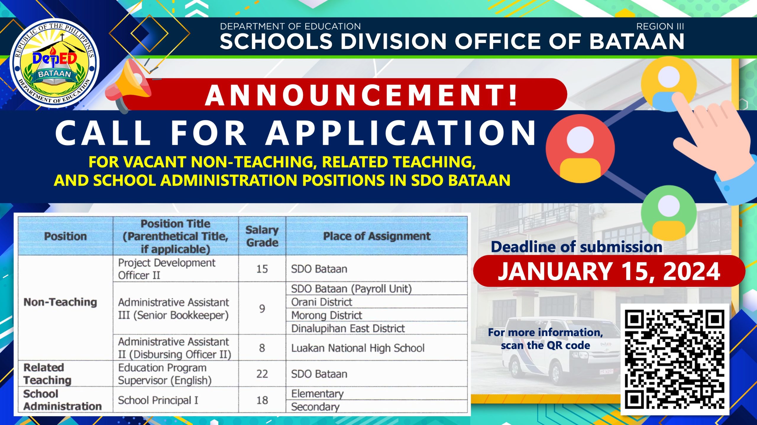CALL FOR APPLICATIONS FOR VACANT SCHOOL ADMINISTRATION AND NON-TEACHING POSITIONS IN SDO BATAAN
